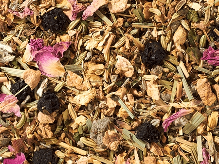 Zutaten: Ingwerstücke (22%), Fenchelsaat, Anissamen, Aroniabeeren (10%), Süßholzwurzeln, Salbeiblätter, Lemongras, Pfefferminze, ganzer Sternanis, Rosenblüten. Enthält Süßholz - bei hohem Blutdruck sollte ein übermäßiger Verzehr dieses Erzeugnisses vermieden werden.